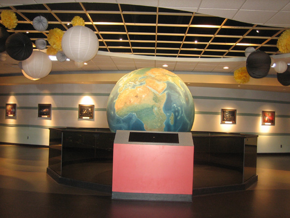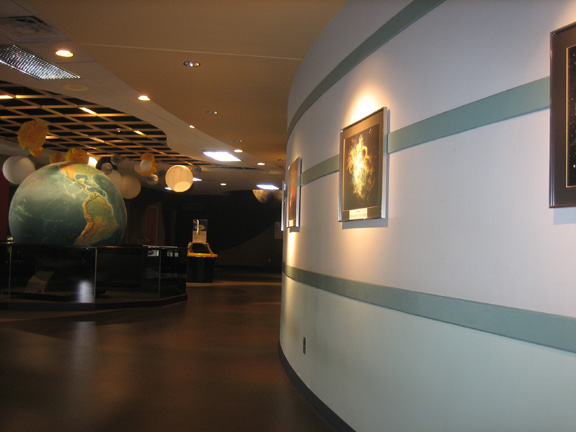 The Exhibit Hall has recently undergone renovations in order to modernize its appearance. Along with a new ceiling design, prominent displays such as the Earth and moon globes have been repositioned. Updated displays include a wall of photos highlighting some of the most stunning astronomical images taken in recent years.
